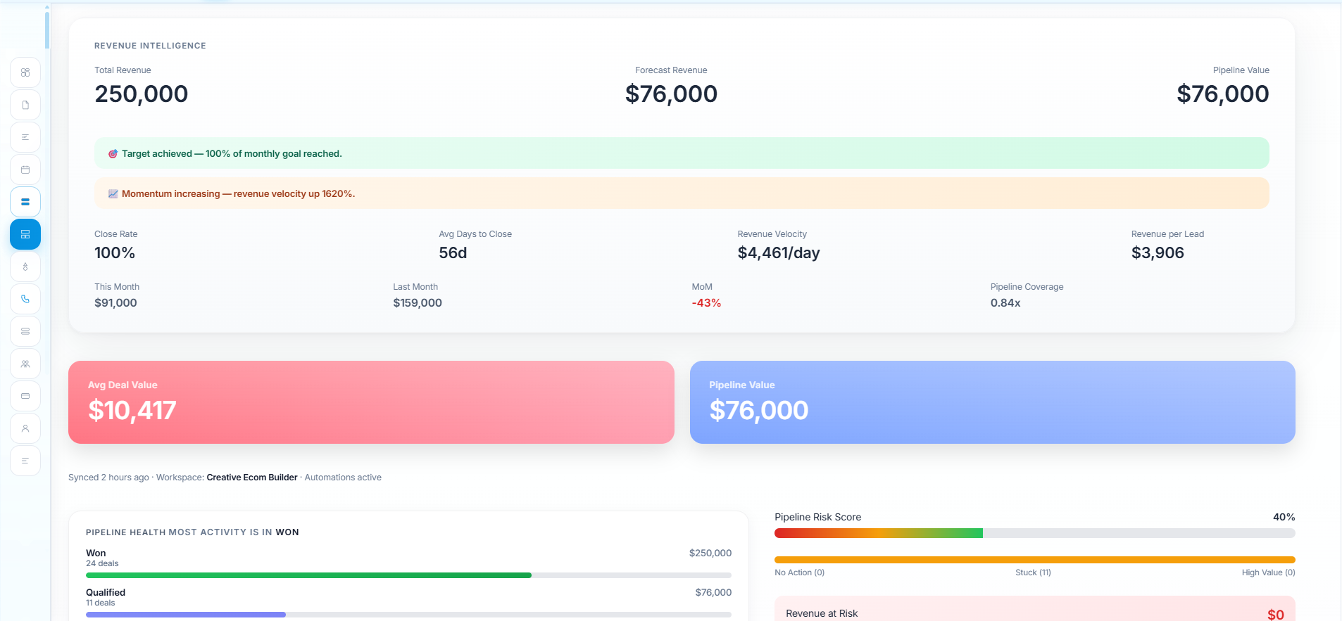 Pipeline value, forecast revenue, close rate, revenue velocity, risk score — automatically calculated from deal data.