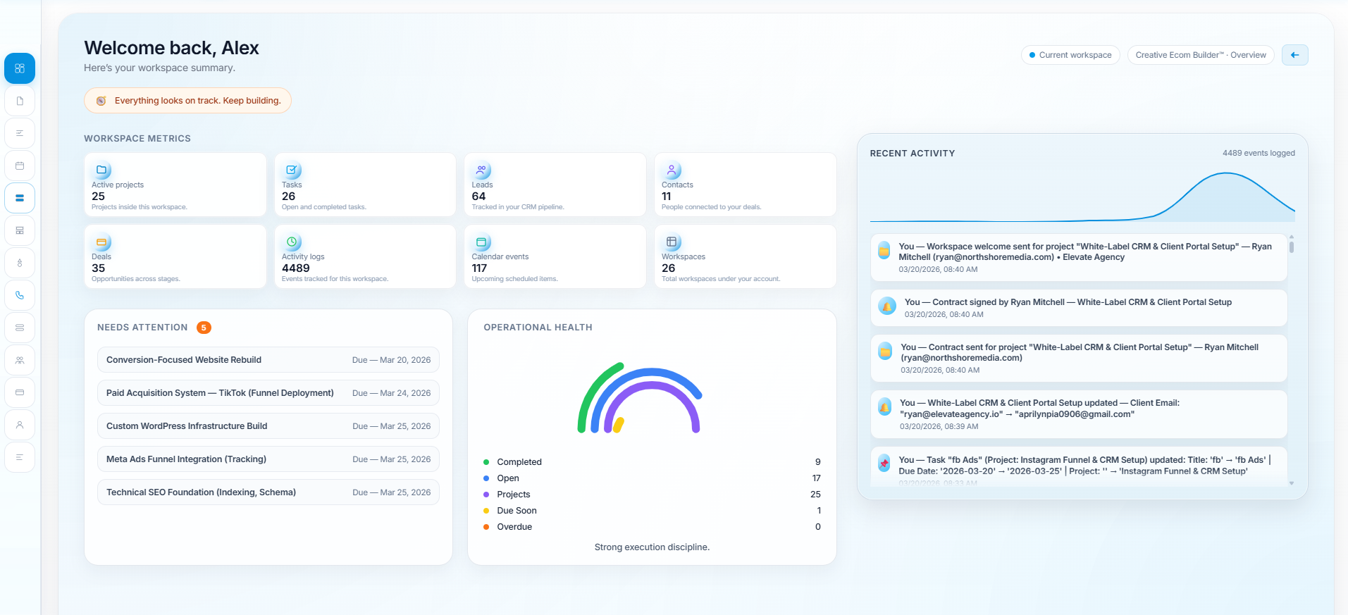 The market assumes someone else handles execution. Most systems are designed for delegation. But you are the closer. The builder. The decision-maker. Creative Ecom Builder™ gives you operational clarity without forcing you to build a team first. From lead capture to delivery, everything runs inside one structured operating layer — contracts sent, onboarding triggered, and client workspaces created automatically. Hire when you're ready. Operate with precision today.